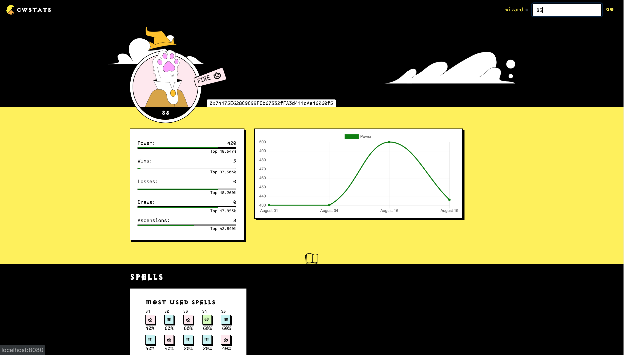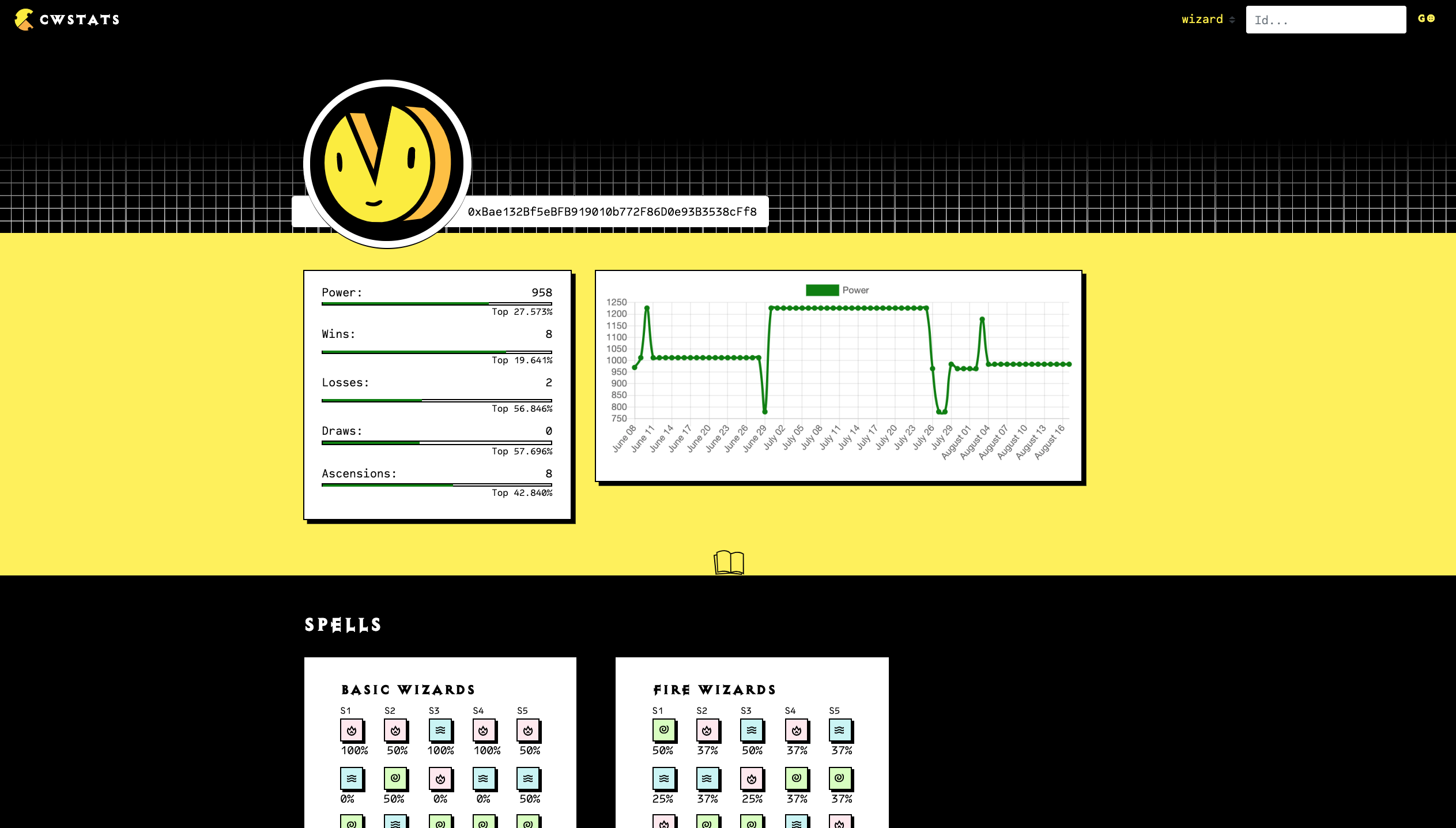 CWStats is a site that shows you all the relevant information about wizards and players who own at least one wizard. Both mobile and desktop users have been in consideration during the development of the frontend.