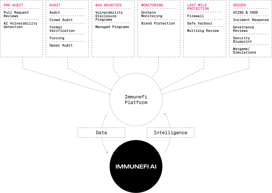 At the core of the OS is Immunefi AI, which is trained on the world’s largest dataset of real exploits, bug reports, and mitigations, continuously expanding through audits, onchain monitoring, formal verification, fuzzing, and bug bounties. This intelligence analyzes each customer’s security posture, predicting and neutralizing threats at machine speed.