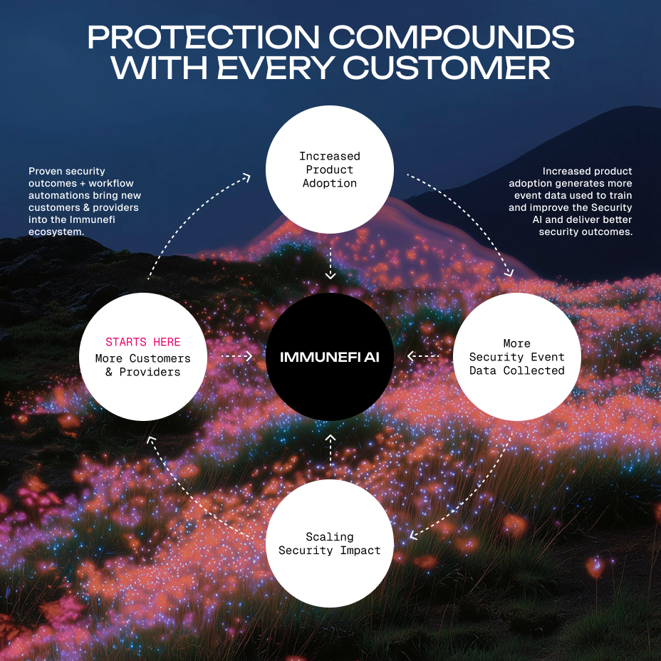 The Immunefi token incentivizes hundreds of high-quality security data points to flow into the Security OS every day from projects and security researchers. This includes threat intelligence from audits, firewalls, automated tooling, PR reviews, bug bounties, and much more. All of this data flows into the Security OS, enabling Immunefi AI to deliver smarter, faster, and more effective protection with every new threat it encounters, without compromising customer privacy or control.
