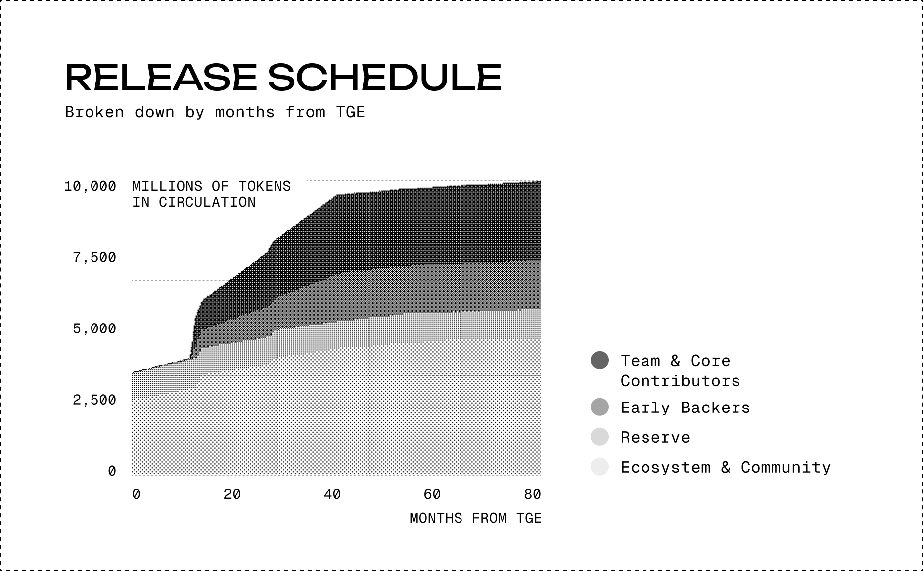 Nearly half of the tokens support ecosystem growth and community rewards. This pool funds pre-listing sales, user incentives (e.g. bug bounty bonuses, staking rewards), partnerships, airdrops, marketing, and liquidity. The large allocation ensures the token directly drives adoption and engagement.