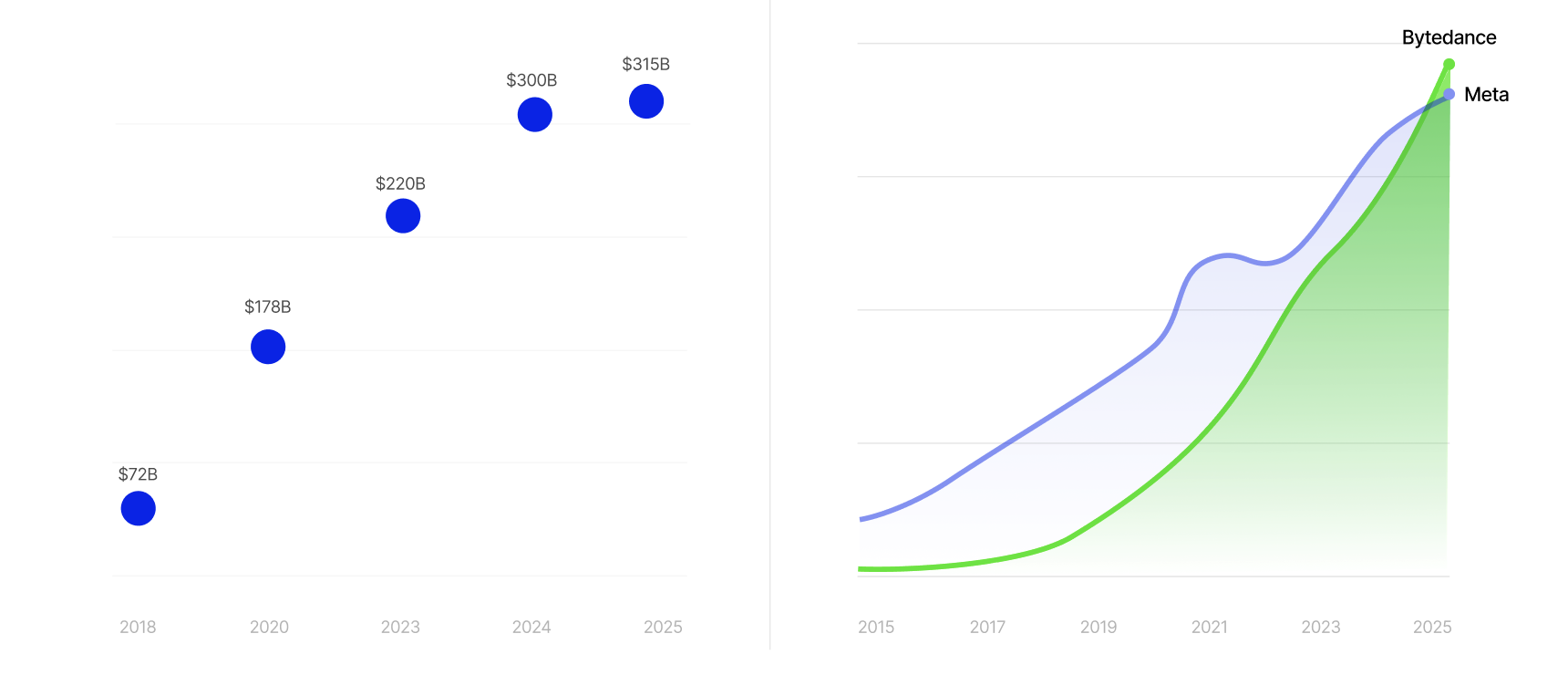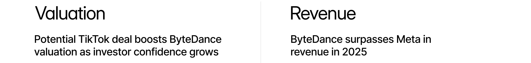 ByteDance Ltd. is a global consumer internet and technology company whose products include TikTok, Douyin, Toutiao, CapCut, and Lark. Together, these platforms reach over a billion users worldwide and have made ByteDance one of the most valuable private companies in the world. For Q1 2025, ByteDance revenue exceeded $43 billion USD, making it the largest social-media firm by revenue that quarter, surpassing Meta Platforms. It also reached this revenue figure faster than Meta.